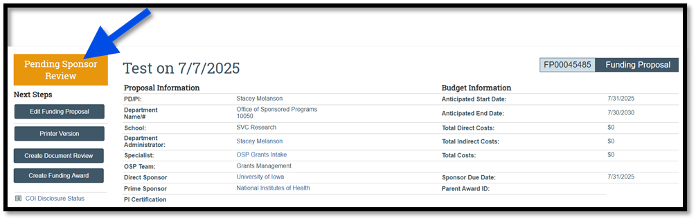 Performing this activity will update the status to “Pending Sponsor Review”, communicate to the Office of Sponsored Programs that the proposal was successfully submitted to the sponsor, and ensure that the proposal is up-to-date and reflected accurately in MyFunding reports (Figure 3).