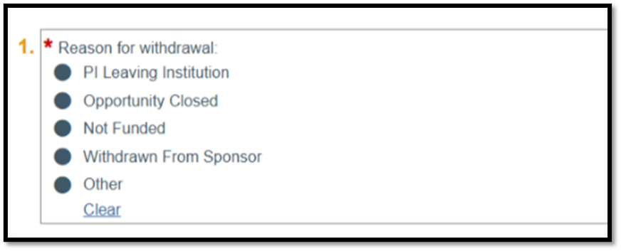 On Funding proposals (FP) that are Pending Sponsor Review, the ‘Withdraw Submitted or Not Funded Proposal’ activity now have email notifications sent to the Principal Investigator (PI), Department Administrator, and editors on the FP (Figure 1). An FP can be withdrawn for various reasons, including being marked as 'Not Funded' or 'Withdrawn from Sponsor' (Figure 2 ).